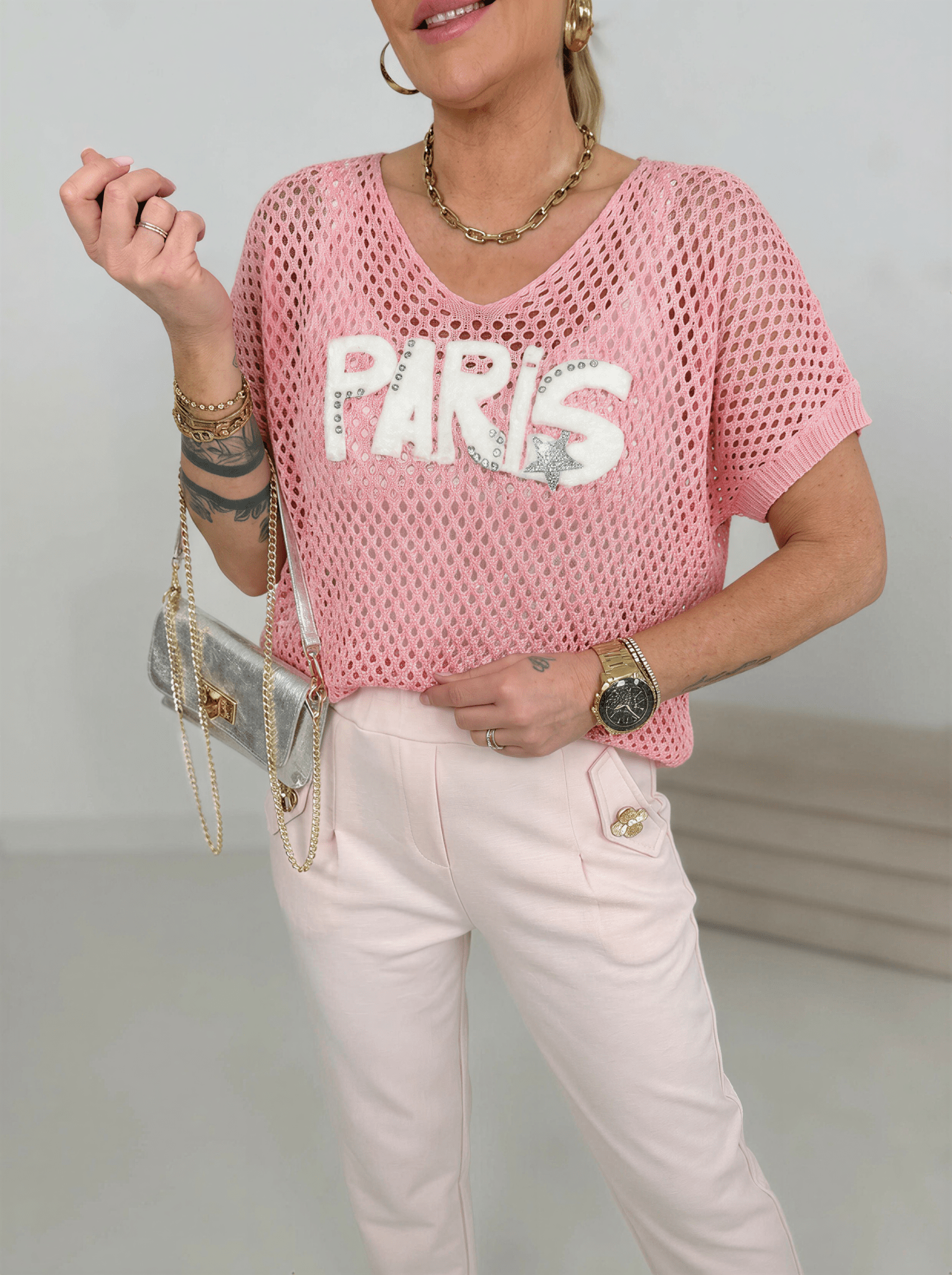 Aufschrift mit Strasssteinen vorne